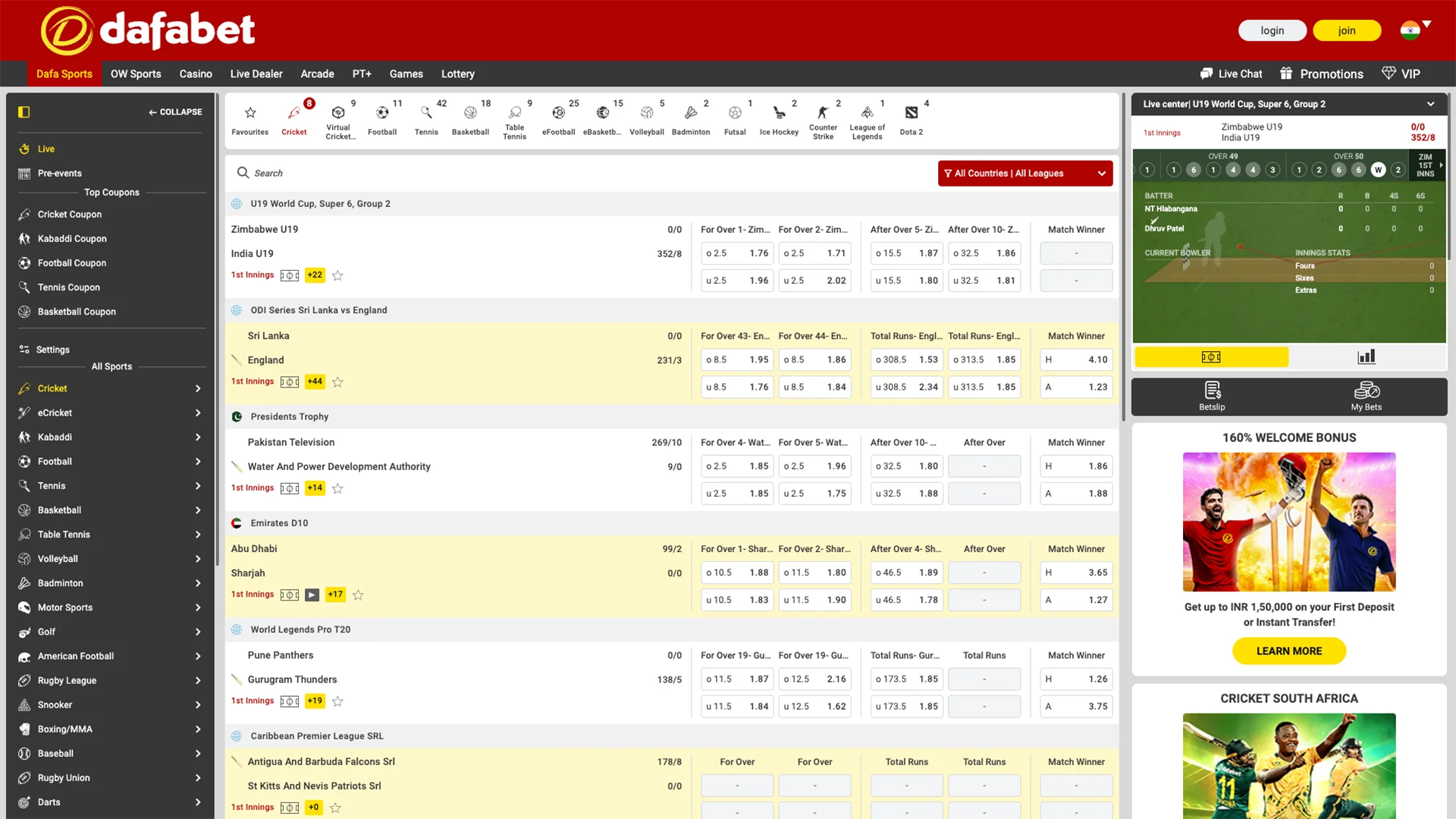 Dafabet offers pre-match and live betting across dozens of sports popular in India and worldwide. Access hundreds of markets daily, including match winners, handicaps, totals, and player-specific outcomes.