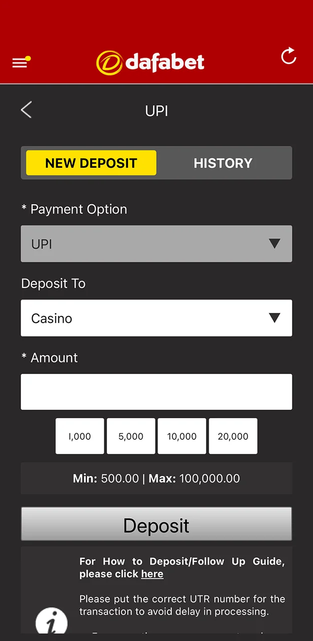 Dafabet accepts UPI, Visa, Mastercard, Skrill, AstroPay, EcoPayz, bank transfers, and cryptocurrency. Most deposits appear instantly in your account balance.